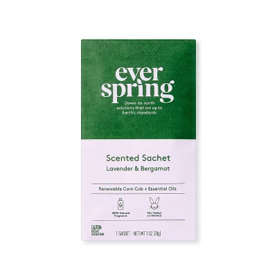Make any space smell better with a Scented Sachet air freshener from Everspring™. This air freshener pouch is filled with renewable corn cob shavings that have been coated in essential oils for a great way to make any small spaces smell fresh without any harsh, unnatural chemicals. The 100% natural fragrance gives off a calming lavender and bright, bergamot, citrus scent that you’ll love breathing in, whether you set the sachet in your dresser drawers, closet, laundry bag, gym bag, suitcase, or vehicle. Simply remove the sachet from its plastic wrapper, place it back in the resealable envelope and put it wherever a little freshening up is needed. The resealable envelope helps protect fabrics and surfaces during use. Tip: A gentle shake of the envelope revitalizes the fragrance for a burst of new freshness.