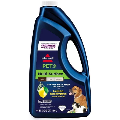 BISSELL® PET Multi-Surface formula is a cleaning solution designed for use in our innovative CrossWave® wet dry vacs that vacuum and wash at the same time, and our SpinWave® hard floor powered spin mops. It’s also safe for use in JetScrub™ Pet carpet cleaner when used with the hard floor attachment. This powerful cleaning formula provides an all-in-one option to clean both sealed hard floors and area rugs*. It is specially formulated to cut through tough kitchen grease and help prevent pet remarking on sealed hard floors. BISSELL® PET Multi-Surface formula removes urine & tough pet messes, as well as dirt, tracked-in mud and stuck-on messes on hard floors. All this formula leaves behind is a fresh lemon-eucalyptus scent and virtually streak-free floors. Plus, it’s safe to use around kids and pets when used as directed. And this formula doesn’t just clean up after pets, it helps save them too! BISSELL proudly supports BISSELL Pet Foundation® and its mission to help save homeless pets. When you buy a BISSELL® product, you help save pets, too. We’re proud to design products that help make pet messes, odors and pet homelessness disappear.