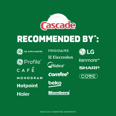 - #1 Recommended Brand in North America* *More dishwasher brands in North America recommend Cascade based on co-marketing agreements vs. other automatic dishwasher detergent brands