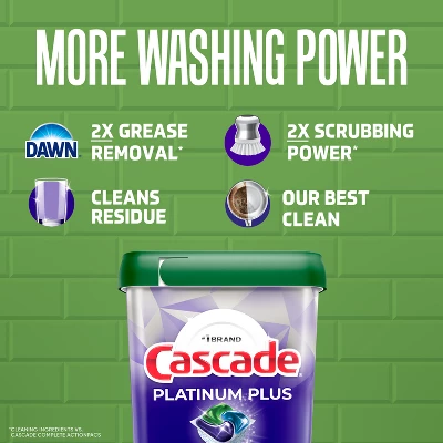 - Only Cascade Platinum Plus contains 2X* the Dawn grease fighting power and 2X* the scrubbing power to power through dried on food *Cleaning ingredients vs Cascade Complete ActionPacs