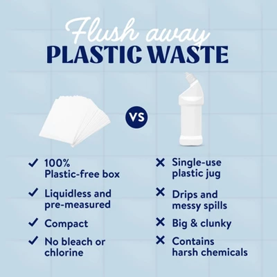 Simply drop a pre-measured sheet into the toilet bowl, wait for it to dissolve, brush with the sudsy water for a thorough clean, and flush away stains, rings, and odors. No splashing, no squirting, and no mess—just a sparkling clean bowl with minimal effort.