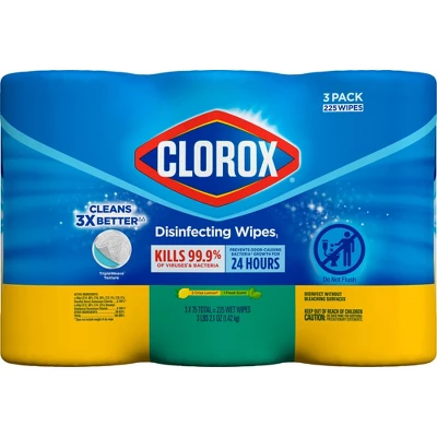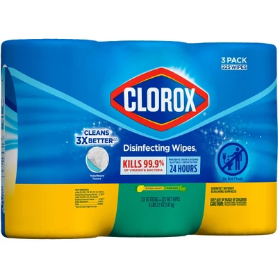 Clorox Disinfecting Wipes with TripleWeave texture kill germs, cleans tough messes and removes 99.9% of allergens on surfaces like kitchen counters bathroom surfaces and more. Disinfecting Wipes clean and disinfect with antibacterial power that kills 99.9% of viruses and bacteria that can live on surfaces, including COVID-19* Virus, staph, E. coli, MRSA, salmonella, strep and Kleb. These all-purpose disposable wipes can prevent the growth of bacteria* for up to 24 hours. Wipes are safe to use on finished wood, sealed granite and stainless steel. Clean with bleach-free wipes to keep dirt and germs away. Do not flush. * Kills COVID-19 virus: kills SARS-CoV-2 on hard, nonporous surfaces. Use as directed. Vs. a paper towel. Prevents the growth of bacteria: odor causing bacteria on non-food contact surfaces. Allow product to air dry.Usage Directions: Directions for Use: It is a violation for Federal law to use this product in a manner inconsistent with its labeling. To clean and remove allergens: Wipe surface clean with this product. Let air dry. To disinfect and deodorize hard, nonporous surfaces: Wipe surface; use enough wipes for treated surface to remain visibly wet for 4 minutes. Let surface dry. For highly soiled surfaces, clean excess dirt first. For surfaces that may come in contact with food, a potable water rinse is required. This product is not for use on dishes, glassware or eating utensils. Not for cleaning or sanitizing skin. Do not use as a diaper wipe or for personal cleansing. Clorox Disinfecting Wipes will not harm most surfaces including acrylic, sealed fiberglass, sealed granite and finished hardwood. Not recommended for use on unpainted wood and unfurnished, unsealed, waxed, oiled or worn surfaces. Test a small area first.Caution Statements: PRECAUTIONARY STATEMENTS: HAZARDS TO HUMAN AND DOMESTIC ANIMALS. CAUTION: Cases of moderate eye irritation. Avoid contact with eyes or clothing. Wash thoroughly with soap and water after handling. FIRST AID: IF IN EYES: Hold eye open and rinse slowly and gently with water 15-20 minutes. Remove contact lenses, if present, after the first 5 minutes, then continue rinsing eye. Call a poison control center for treatment advice. Have the product container or label with you when calling a poison control center or doctor, or going for treatment. PHYSICAL OR CHEMICAL HAZARDS: Do not use or store near heat or open flame.