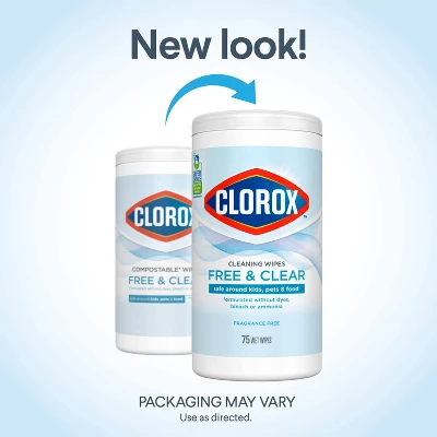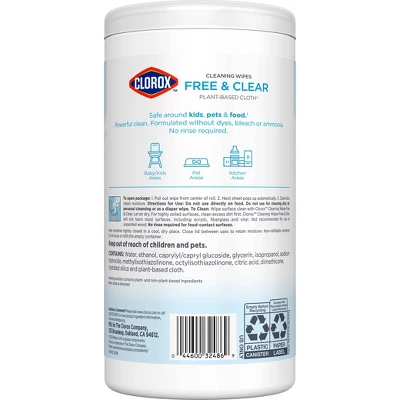 The clear solution for a clean home. Safe around kids, pets and food contact surfaces when used as directed, Clorox Free & Clear Cleaning Wipes are formulated without dyes, bleach or ammonia yet deliver a powerful clean thats gentle on surfaces. These fragrance free Clorox wipes pick up dirt. These cleaning wipes are tough on grease and can cut through grime on a variety of hard surfaces like acrylic, sealed fiberglass, sealed granite, finished hardwood and vinyl. Clorox Free & Clear Cleaning Wipes meet Us EPAs Safer Choice safer product standards. Grab these easy, accessible cleaning wipes for everyday cleanups and tough messes. Do not flush.