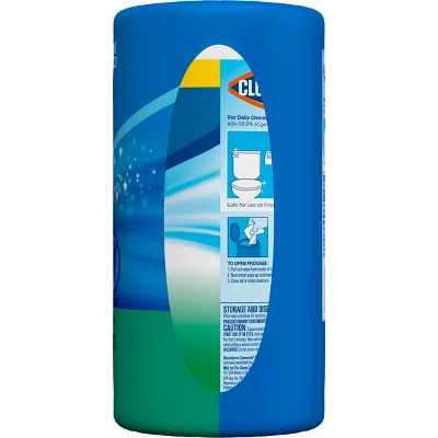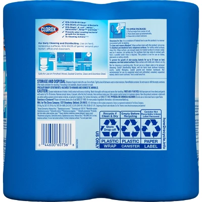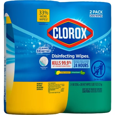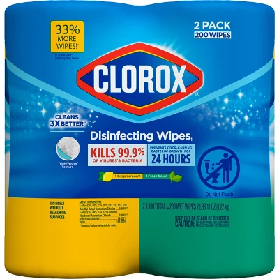 Clorox Disinfecting Wipes with TripleWeave texture kill germs, clean tough messes and remove 99.9% of allergens (1) on surfaces like kitchen counters, bathroom surfaces and more. Disinfecting Wipes clean and disinfect with antibacterial power that kills 99.9% of viruses and bacteria that can live on surfaces, including COVID 19 (2) Virus, staph, E. coli, MRSA, salmonella, strep and Kleb. These all purpose disposable wipes can prevent the growth of bacteria (3) for up to 24 hours. Wipes are safe to use on finished wood, sealed granite and stainless steel. Clean with bleach free wipes to keep dirt and germs away. Do not flush. (1) Pet dander, dust mine matter, pollen particles, grass. (2) Kills SARS CoV 2 on hard, nonporous surfaces. Use as directed. (3) Odor causing bacteria on non food contact surfaces. Allow product to air dry. (4) Vs. a paper towel.Usage Directions: To clean and remove allergens (1): Wipe surface clean with this product. Let air dry. To disinfect and deodorize hard, nonporous surfaces: For visibly soiled surfaces, clean first. Wipe surface; use enough wipes for treated surface to remain visibly wet for 4 minutes. Let surface dry. For surfaces that may come in contact with food, a potable water rinse is required. This product is not for use on dishes, glassware, or eating utensils.Caution Statements: PRECAUTIONARY STATEMENTS: HAZARDS TO HUMAN AND DOMESTIC ANIMALS. CAUTION: Causes moderate eye irritation. Avoid contact with eyes or clothing. Wash thoroughly with soap and water after handling. FIRST AID: IF IN EYES: Hold eye open and rinse slowly and gently with water for 15-20 minutes. Remove contact lenses, if present, after the first 5 minutes, then continue rinsing eye. Call a poison control center for treatment advice.