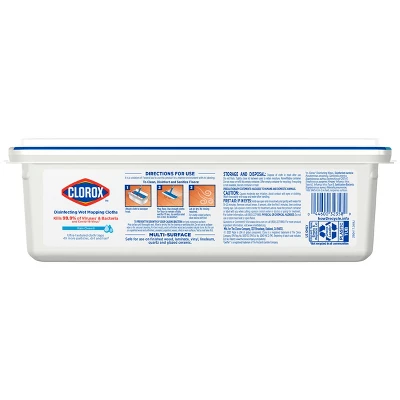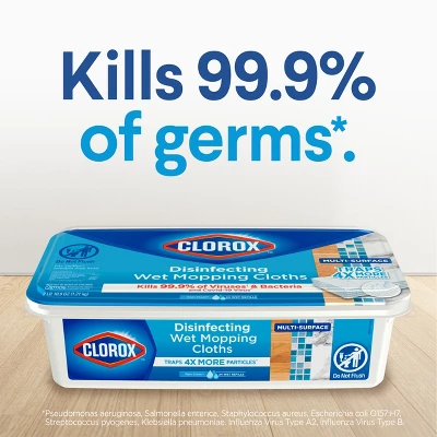 Count on Clorox Disinfecting Wet Mopping Cloths to clean and disinfect your floors. Suited for multi surface use, these mopping cloths for floor cleaning are bleach free with ultra textured fabric to trap 4X more particles, dirt and hair* and prevent bacteria growth** for up to 24 hours. They also eliminate 99.9% of viruses and bacteria*** including COVID 19**** virus, while leaving a fresh Rain Clean scent. Fits Swiffer Sweeper mop heads. Certain trademarks used under license from Procter & Gamble Company or its affiliates. *vs Clorox Disinfecting wipes. **Prevents odor causing bacteria on non food contact surfaces. ***Pseudomonas aeruginosa, Salmonella enterica, Staphylococcus aureus, Escherichia coli O157:H7, Streptococcus pyogenes, Klebsiella pneumoniae. Influenza Virus Type A2, Influenza Virus Type B when used as directed on hard nonporous surfaces. ****Kills SARS CoV 2 on hard, nonporous surfaces, when used as directed.Usage Directions: It is a violation of Federal law to use this product in a manner inconsistent with its labeling. To clean, disinfect and sanitize floors: Attach cloth to sweeper head. Mop floor. Use enough cloths for floor to remain visibly wet for 10 sec. to sanitize and for 4 min. to disinfect. Let air dry. No rinsing required. For visibly soiled surfaces, clean excess dirt first.