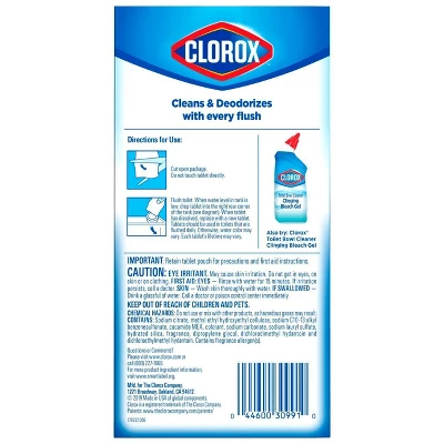 Clorox Ultra Clean Toilet Tablets Bleach & Blue cleans and deodorizes your toilet bowl with every flush and leaves a fresh Rain Clean Scent. These toilet bowl cleaning tablets continuously cleans, prevents stains and deodorizes, eliminating the need to scrub every time. Each tablet leaves the toilet bowl sanitary in 5 minutes, and delivers a long-lasting Bleach & Blue clean that is good for up to 4 months. And, with this 2-pack, you can keep your toilet clean and the dreaded toilet ring away for up to 8 months, and help extend the time between deep cleans. Simply drop a tablet into your toilet tank and watch it do its thing. When the blue water fades, it is time to drop in another tablet. Keep your toilet bowl sparkling fresh and ultra clean with no mess and no fuss with the help of Clorox Ultra Clean Toilet Tablets Bleach & Blue.