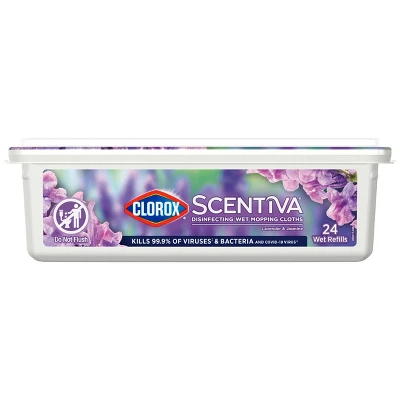 Clorox Scentiva Disinfecting Wet Mopping Cloths combine the trusted cleaning power of Clorox with the captivating scent of Lavender and Jasmine to transform your home. Clorox Scentiva scents are inviting blends that elevate your cleaning experience. Clorox Scentiva mopping cloths for floor cleaning eliminate 99.9% of viruses* and bacteria, including COVID-19** virus, while filling your home with long lasting scents. These Clorox wipes for mopping are bleach free and feature ultra textured fabric that traps 4X more particles, dirt and hair*** and prevent bacteria growth**** for 24 hours. *Pseudomonas aeruginosa, Salmonella enterica, Staphylococcus aureus, Escherichia coli O157:H7, Streptococcus pyogenes, Klebsiella pneumoniae, Influenza Virus Type A2, Influenza Virus Type B when used as directed on hard, nonporous surfaces. **Kills SARS-CoV-2 on hard, nonporous surfaces. ***vs Clorox Disinfecting wipes. ****Prevents odor causing bacteria on non food contact surfaces.Usage Directions: It is a violation of Federal law to use this product in a manner inconsistent with its labeling. To clean, disinfect and sanitize floors: Attach cloth to sweeper head. Mop floor. Use enough cloths for floor to remain visibly wet for 10 sec. to sanitize and for 4 min. to disinfect. Let air dry. No rinsing required. For visibly soiled surfaces, clean excess dirt first. Safe for use on finished wood, laminate, vinyl, linoleum, quartz and glazed tile.Caution Statements: Causes moderate eye irritation. Avoid contact with eyes or clothing. Wash thoroughly with soap and water after handling. FIRST AID: IF IN EYES: Hold eye open and rinse slowly and gently with water for 15-20 minutes. Remove contact lenses, if present, after the first 5 minutes, then continue rinsing eye. Call a poison control center for treatment advice. Have the product container or label with you when calling a poison control center or doctor, or going for treatment.