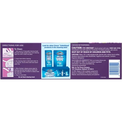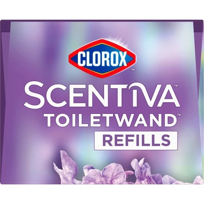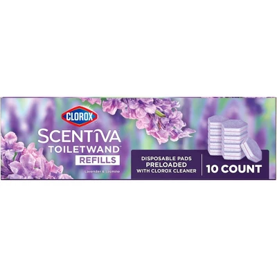Clorox Scentiva ToiletWand Refills combine the trusted cleaning of Clorox with the refreshing scent of Lavender and Jasmine for an elevated cleaning experience. Clorox Scentiva scents are well crafted, curated and inviting blends that make a sophisticated addition to your cleaning products. Each disposable scrubbing pad is preloaded with Clorox Cleaner that powers through hard water and lime stains 2X faster than when using a toilet brush with manual toilet bowl cleaner. Designed for optimal reach, hexagonal shaped scrubbing pads conform to hard to reach areas like under the rim. The floral scent neutralizes odors without the bleach smell. Use this non abrasive formula to clean a variety of surfaces, including porcelain, chrome, enamel and synthetic marble. Never touch an icky toilet brush again: disposable scrubbing pads conveniently pop off into the trash so you can toss the mess every time. Designed for use with the Clorox ToiletWand handle (sold separately).Usage Directions: To Clean: Open pouch of disposable cleaning heads and push handle straight down onto cleaning head unit until it clicks into place. Empty bowl before cleaning. Dip cleaning head in toilet bowl water for 1 to 2 seconds. Scrub entire toilet bowl above water line. When finished, release excess water by pressing cleaning head against toilet bowl and slide blue button forward to release head into trash bin. Flush to rinse toilet. Do not flush cleaning head.Caution Statements: CAUTION: EYE IRRITANT. Avoid contact with eyes. FIRST AID: EYES: Immediately rinse with water for 15 minutes. If irritation persists, call a doctor. KEEP OUT OF REACH OF CHILDREN AND PETS.