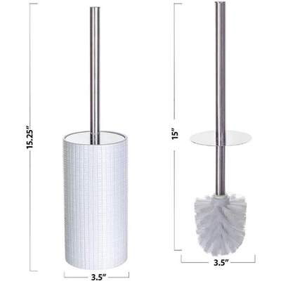 ACCENTUATE YOUR BATHROOM WITH CONTEMPORARY ELEGANCEMake a StatementClean and classy, our Estella collection stands out with timeless elegance. With a touchof white, a flash of silver, and a bit of texture to bring the beauty to life, it’s the perfectchoice for anyone looking for contemporary décor that will keep inspiring complimentsfor years. You’ll love the sleek and stylish look of this decorative toilet brush holder, withits space-friendly design that matches any bath. Place it in the guest bathroom or masterbath and give it an instant facelift.Hygienic StorageKeep the actual toilet cleaning brush out of sight with effortless ease. We’ve thoughtfullydesigned our loo brush with a lid attached to the handle. This means you get to coverand uncover the brush without ever having to come into contact with the container.And you’ll never have to worry about rust ruining the look either. Made usingcorrosion-proof polyresin, this fancy toilet brush remains elegant through it all.Here’s why you’ll love this loo brush:- Touch of white and silver matches any décor.- Measures 15.25” x 3.5” to easily fit most bathrooms.- Designed with heavy-duty bristles for a thorough clean.- Thoughtfully designed lid and container make for hygienic storage.- Heavy-duty polyresin never rusts or tarnishes.- Backed by a no-hassle, 100% money-back guarantee.Upgrade your bathroom with a toilet brush that doubles as elegant décor!