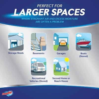 - IDEAL FOR USE IN LARGE SPACES: Hi-capacity moisture absorbers are ideal for use in large spaces like basements, garages, stored boats & RVs, crawlspaces, storage areas and anywhere excess moisture and stagnant air are a problem.