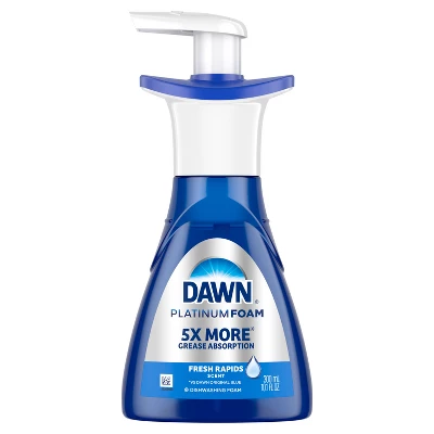 Your toughest everyday messes are no match for Dawn Platinum Dish Foam. With 5X MORE Grease Absorption* (*based on cleaning ingredients per drop vs. Dawn Ultra Original). Dawn Platinum Dish Foam can handle your toughest job. There’s no need to fill the sink with water. Simply apply one pump of Dawn Platinum Dish Foam to a damp sponge and wash dishes until they’re done. With powerful ready made suds, just one pump cleans a sink full of dishes*(*based on average load).