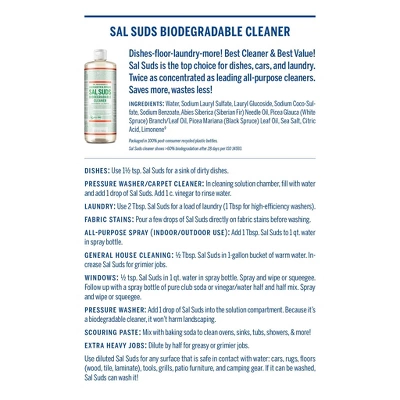 Save and clean with Sal Suds! Use this ultra-concentrated and versatile all-purpose cleaner for non-toxic cleaning in your home (when used as directed). Use this all-purpose cleaner for just about any cleaning task—dilute to wash dishes, laundry, floors, and more! Safe on any surface that can get wet—stone, tile, stainless steel, fabrics, carpets—replace multiple products with one bottle! Waterless or concentrated product to minimize packaging