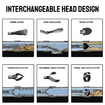 The machine comes complete with a pair of gloves and six interchangeable cutting heads: Drop Head Auger, Boring Bulb Cutter, C-Cutter, Side Cutter, Spade Cutter, and Saw Tooth Cutter. These attachments offer flexibility to handle various types of obstructions, enhancing the overall versatility of the device.Â