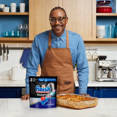 The new and improved Finish Quantum with Activblu technology gives you the next level of clean with superior clean and shine*. Three separate fast-dissolving chambers deliver three power actions: break down and lift toughest messes, grease cutting power, and a finishing boost of shine. The three separate chamber dishwasher pod delivers the cleaning power of an overnight soak, scrubbing away even 24-hour dried on food! Advanced powder with bleach seeks out and cleans tough stains like tea and coffee. No need to pre-soak or pre-rinse. This formula cleans in short cycles and provides glass protection. Our quick dissolving dishwasher pod washes away residue for an amazing sparkling shine. *vs. AiO; improved formula vs. previous Finish Quantum