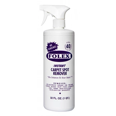 FOLEX® Instant Carpet Spot Remover quickly removes the toughest spots and stains from carpets, rugs, and upholstery without rinsing, vacuuming, or waiting to see the results. The amazing surfactant action powers out both new and old stains. Our water-based, non-ionic formula does not leave a sticky residue so stains will not reappear. Works on any colorfast carpet, fabric or material that can be safely dampened with water. Safe to use around children and pets if used as directed!