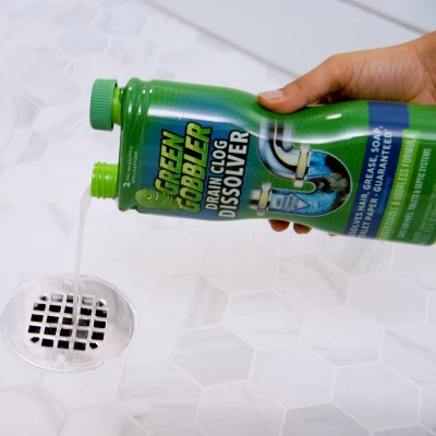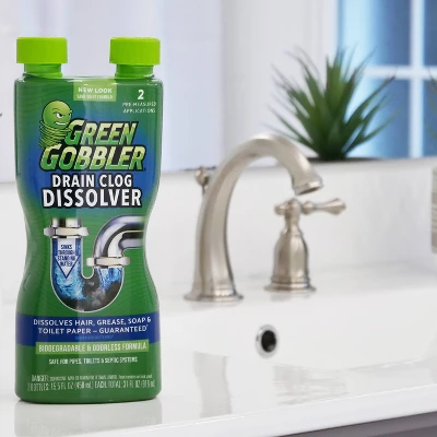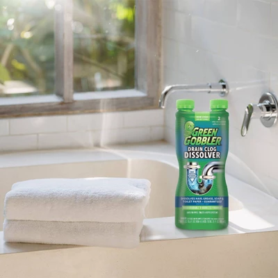 “Green Gobbler Dissolve Liquid Drain Clog Dissolver is an environmentally-friendly 2-step formula to unclog your drains.