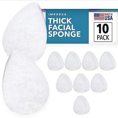 Extra Thick Facial Sponges By Impresa Products Our cleansing facial pads are a great way to gently and easily add exfoliation and deep clean to your daily beauty routine. Extra Thick Buff-Puf style sponge pads are designed to remove dead skin cells for Normal to Oily Skin can really make a difference to your skin condition and can also help your skin look and feel younger. When used with your daily cleanser or soap gently apply our sponge with mild to no pressure in order to help to remove makeup, dirt and excess oil; leaving your skin smooth, soft and perfectly prepped for your daily moisturizer, cosmetics or tanning lotion. – Our extra thick facial pads are reusable, come in a value pack of 10 Pufs per box and Made In The USA. How to Use 1.) Apply your cleanser to the facial sponge 2.) Gently dampen the puff pad with warm water 3.) Apply sponge to your face and neck, gently cleanse in a circular motion 3.) Repeat if removing heavy makeup 4.) Rinse & dry face 5.) Leave your Buff-Puf style sponge pad to dry naturally for your next use