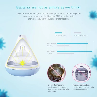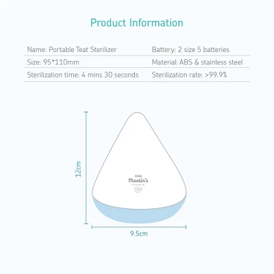 The high-intensity UV sterilizer quickly and efficiently sanitizes baby essentials, eliminating 99.9% of germs in less than 5 minutes. Ideal for busy parents, this battery-operated unit is compact enough to fit in diaper bags, making it perfect for travel. It also serves as a convenient storage case for teats and pacifiers. Designed with safety in mind, it is ozone-free and includes UV safety features.