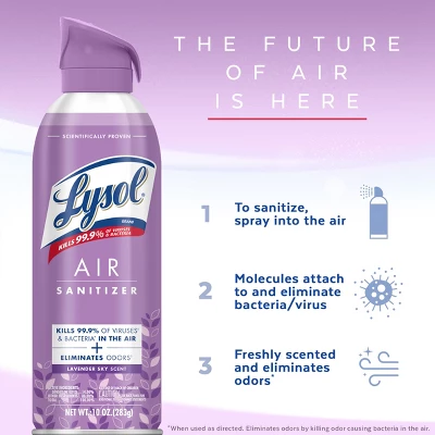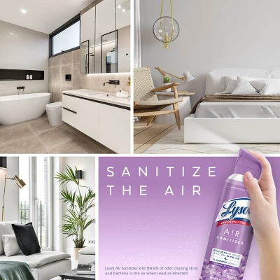 - SANITIZE THE AIR THROUGHOUT YOUR HOME: Lysol Air Sanitizer Spray sanitizes and eliminates 99.9% of odor causing bacteria* in the air. Enjoy the lavender scent. (*Use as directed).