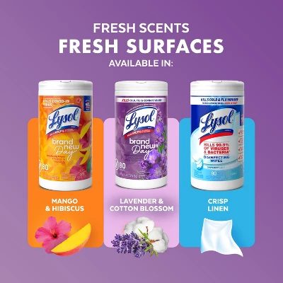 When it comes to disinfecting products, you want a brand you trust and a scent you love. Enter the Lysol Brand New Day™ series — Specially formulated, refreshing lavender fragrance in stylized packaging to reinvigorate your disinfecting experience. Lysol Disinfecting Wipes are a convenient way to clean and disinfect over 100 surfaces*, including countertops, sinks, bathtubs, showers, toilet seats, light switches, door knobs, electronics, and more. Each pre-moistened disposable wipe kills 99.9% of germs* — No bottles, no sponges, no mess. Effective disinfecting made easy.