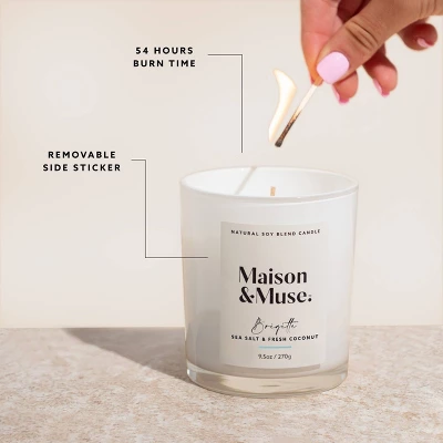 Maison&Muse candles feature a recyclable and reusable glass jar, along with a metal-free wick for a cleaner burn. Paired with a sleek metal lid and a removable side sticker for ultimate design quality and versatility. Maison&Muse is committed to cruelty-free practices.