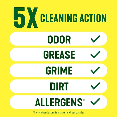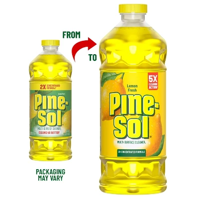 With Pine-Sol Lemon Fresh Multi-Surface Cleaner, you only need one cleaner to fight tough dirt, grease and grime. This lemon scented Pine-Sol gives you 5X cleaning action as it deodorizes, cuts through grease, removes grime, tackles tough dirt and removes 99% of allergens (1), all while leaving a bright and vibrant Lemon Fresh scent that transports your senses to a sundrenched lemon grove. Pine-Sol Lemon Fresh cleans (almost) anything: Pine-Sol is suitable for use on sealed wood, tile, stone, porcelain, glass and more when used as directed. Do not use on marble, aluminum, copper or wood that is unfinished, unsealed, unpainted, waxed, oiled or worn. (1) Non living dust mite matter and pet dander. (2) Vs. unconcentrated Pine-Sol Multi-Surface Cleaner.Usage Directions: GENERAL CLEANING: Mix 1/8 cup per gallon of water. Mop, wipe or spray with solution. Prepare solutions daily. HEAVY DUTY: For tough jobs, use full strength and rinse immediately. Do not use on marble, aluminum, copper or wood that is unfinished, unsealed, unpainted, waxed, oiled or worn. Do not use or mix with bleach-containing products.Caution Statements: CAUTION: EYE IRRITANT. Do not get in eyes. FIRST AID: EYES: Rinse with water for 15-20 minutes. Call a doctor or poison control center if irritation persists. KEEP OUT OF REACH OF CHILDREN AND PETS.