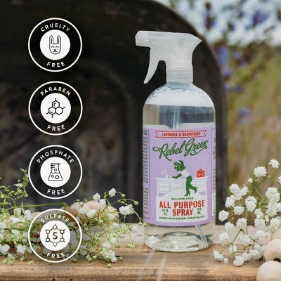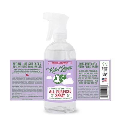 Skip the elbow grease and just go with the flow! Plant-based and biodegradable, Rebel Green All Purpose Spray is safe for non-porous surfaces. Naturally free from chlorine, ammonia, phthalates, parabens, phosphates and artificial colors. Kissed with essential oils, it contains no synthetic fragrances. After use, all you are left with is a hint of your favorite scent and a sparkling clean surface! Made in the USA.