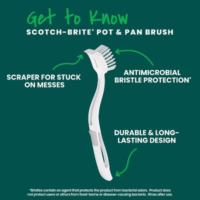 Effortlessly tackle tough messes with the Scotch-Brite Pot + Pan Brush. This durable, long-handled dish scrubber brush features two types of bristles for efficient cleaning and scrubbing. Its sturdy plastic construction is built to last, allowing you to clean mess after mess while wasting less. For an even cleaner experience, the bristles are treated with an antimicrobial agent that resists bacterial odors*. Despite its robust design and strong bristles, it cleans cookware, stainless steel, outdoor furniture, tubs, showers, and sinks without leaving a scratch. With a long handle and a built-in scraper, this scrubbing brush gives you the leverage you need to conquer stuck-on messes while keeping your hands out of it. It easily rinses clean of soap and food residue, but when it’s time for a deeper refresh, this dishwasher brush can be cleaned and sanitized up to 20 times in the top rack of your dishwasher. Make stubborn messes disappear with the versatile Scotch-Brite Pot + Pan Brush. Scotch-Brite cleaning supplies give you the power to quickly clean up life’s everyday messes. Trusted for over 65 years**, Scotch-Brite is known for innovation in cleaning tools and our commitment to quality and satisfaction.