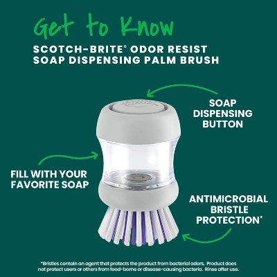 - PACK OF ONE: One Scotch-Brite Odor Resist Soap Dispensing Palm Brush, a multipurpose dish scrub brush for everyday cleaning and scrubbing that rinses clean