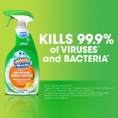 Scrubbing Bubbles Bathroom Grime Fighter kills 99.9% of viruses^ and bacteria* especially on countertops or shower walls and in hard-to-reach places like tile grout or around bathroom fixtures. Disinfect your bathroom surfaces, remove 100% of soap scum, and freshen with a Citrus fragrance.