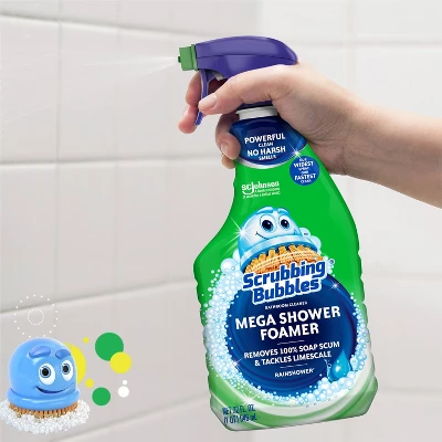 - • Scrubbing Bubbles Mega Shower Cleaner has a foaming, grime-busting formula
