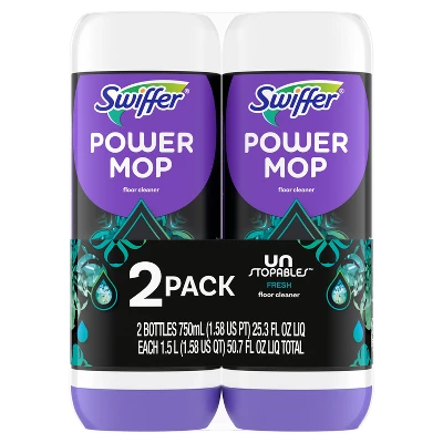 - Includes 2 25.3 fl oz bottles of Swiffer PowerMop Floor Cleaning Solution, Unstopables Fresh Scent