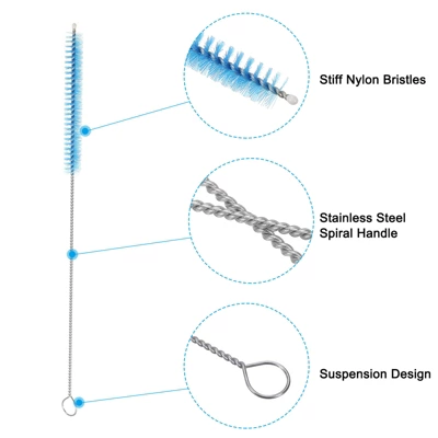 The bristles are made of hard nylon fibers, and the handle is wrapped with stainless steel wire, which is flexible and easy to bend, so you can easily brush even curved parts such as the neck of a teapot. The rubber coating prevents the wire from scratching the inner wall of the cup. The spiral bristle design ensures that the brush fully contacts the wall of the straw for a more comprehensive cleaning. It can be used for water bottle straws, funnel necks, teapot necks, and coffee cups. It can also be used in small gaps such as electric fans, circuit boards, keyboards, and water bottle screws. How to use: Insert the brush into the straw, rotate it from top to bottom to clean, and hang it to drain after use. Note: Avoid excessive force when cleaning to avoid damaging the brush or the inner surface of the straw. Clean the brush regularly to keep it clean and extend its service life.