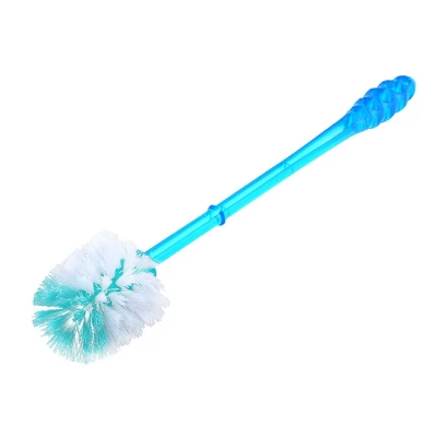 This household scrubbing brush features a blue plastic angled handle and a round head with flexible white bristles. The roundhead design makes it effective for various cleaning tasks. The long, transparent handle ensures a comfortable grip while using the brush. It also includes a built-in hanging hole for convenient storage, helping keep it dry and clean after daily use. It is an ideal tool for cleaning toilet bowls and bathroom fixtures.