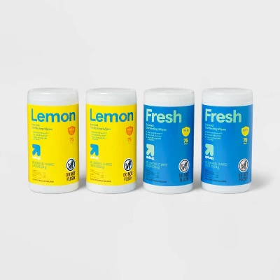 Disinfect surfaces and prevent cross-contamination by wiping them down with these 75-Count 4-Pack Lemon and Fresh All-Purpose Disinfecting Wipes from up&up™. These multipurpose disinfecting wipes kill germs, clean tough messes and remove 99.9% of allergens on surfaces like countertops, sinks, bathtubs and more, while their fresh lemon scent will instantly uplift your mood. Great for use on a variety of surfaces, they come in convenient containers that are easy to store anywhere.