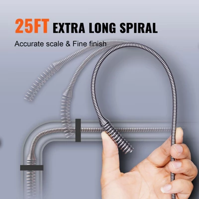 Flexible Enough Spring: 1/4in thick spiral head is easy to grab hair clogs, gently and thoroughly cleaning with a flexible yet rigid 25ft long cable that can reach further into different drain systems like S or L pipe layouts. This product specializes in the quenching treatment, which can be bent arbitrarily and pass every corner without effort.