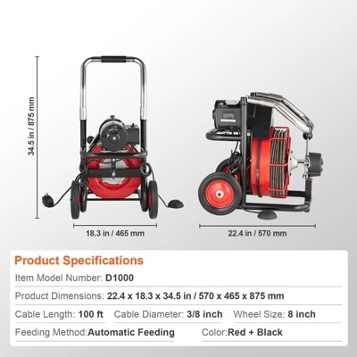Portable and Space-Saving: Take it anywhere, store it with ease! This drain cleaning machine is equipped with 8-in wheels, enabling effortless movement. The foldable handle provides a comfortable grip, while making it convenient to store when not in use