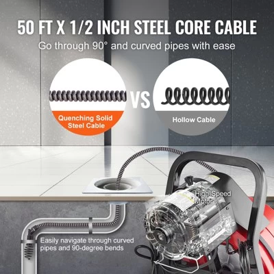 Premium Steel Core Cable: Our 50 FT x 1/2″ sewer snake machine steel core cable is designed to resist breakage, twisting, and corrosion, ensuring easy navigation through complex curved pipes from 2 to 4-inch, ensuring smooth and efficient cleaning process