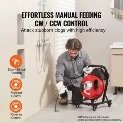 Attack Stubborn Clogs: VEVOR drain cleaner machine features an automatic feed control system to power the cable in and out of drainage pipes. Enhanced with forward/reverse control and air-activated foot switch, managing the cable becomes more effortless